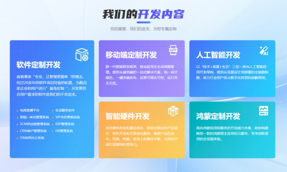 对于有独特业务需求或专注于特定行业的组织,依托完善的开发流程、专业的技术团队、透明的开发过程,森普将创新构想转化为特色行业的现实生产力。提供软件定制开发、移动端定制开发、人工智能开发、智能硬件开发、鸿蒙定制开发五大开发服务,并在深度支撑智慧校园、智慧充电等特色行业场景富有成功落地经验。