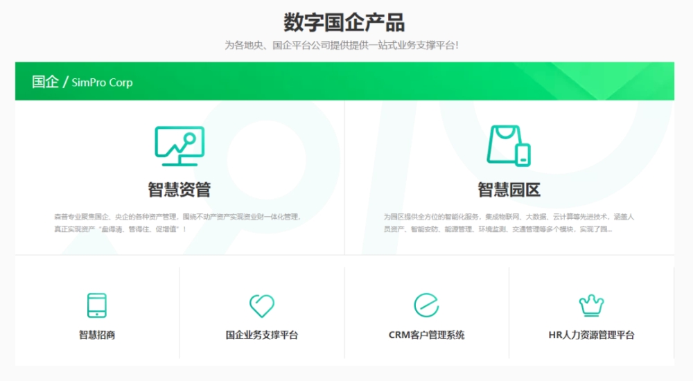 深度对接“企业数字化转型”与“数字经济发展”的国家战略,森普提供企业一站式业务支撑平台,包括智慧资管、智慧园区、智慧招商、智慧矿山、智慧金融、CRM客户管理系统、HR人力资源管理、VIP会员营销系统等专业产品。