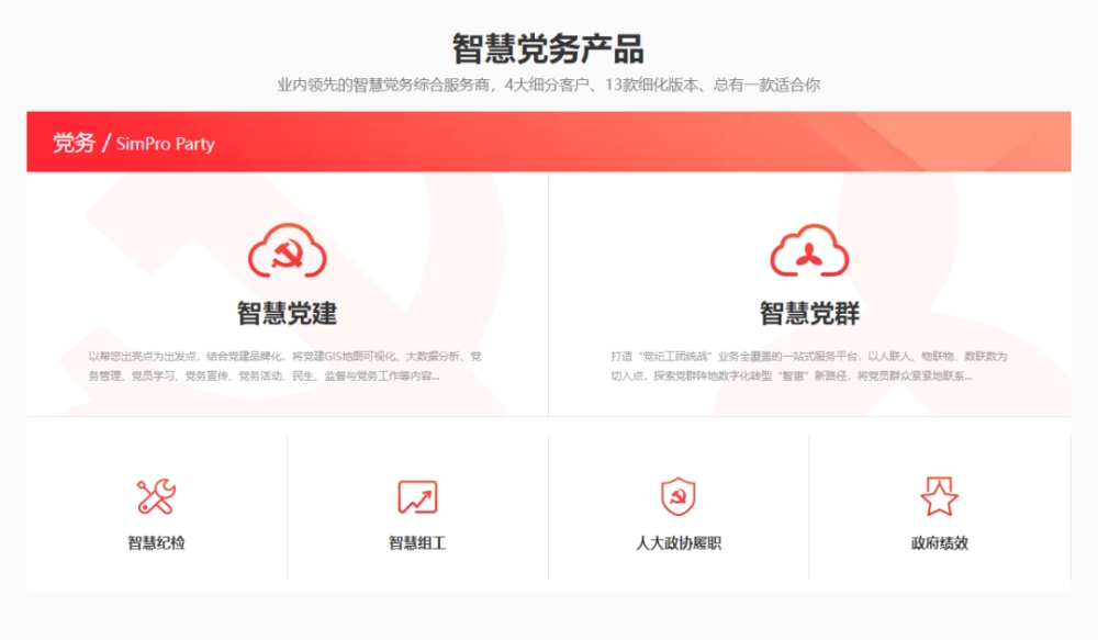紧密契合“数字中国”建设与新时代党的建设总要求,以数字化手段赋能组织工作创新,追求党建工作科学化、精细化与智能化,森普为各级党政机关提供智慧党建、智慧纪检、智慧党群、智慧组工、人大政协履职、政府绩效、智慧统战、智慧人大等全方位产品。