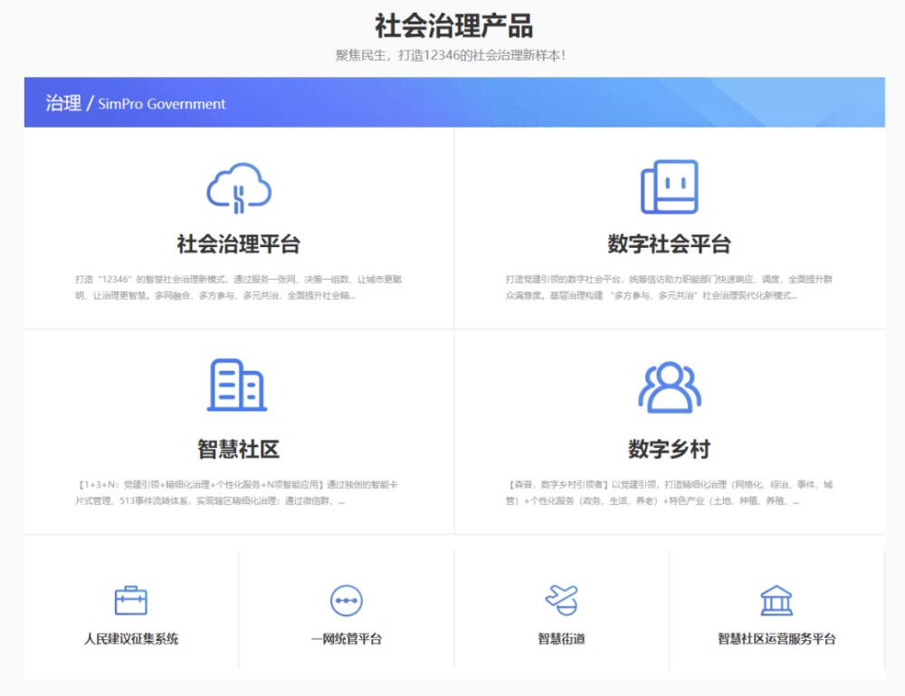 为积极响应国家推动政务服务“一网通办”、“一网统管”和治理现代化落地基层的关键实践,森普助力各级政府聚焦民生,提供智慧社区、智慧治理、数字乡村、智慧农业、数字社会、人民建议征集、一网统管、智慧街道、智慧政务、智慧拆迁、智慧外事、社区运营服务平台等系列解决方案。